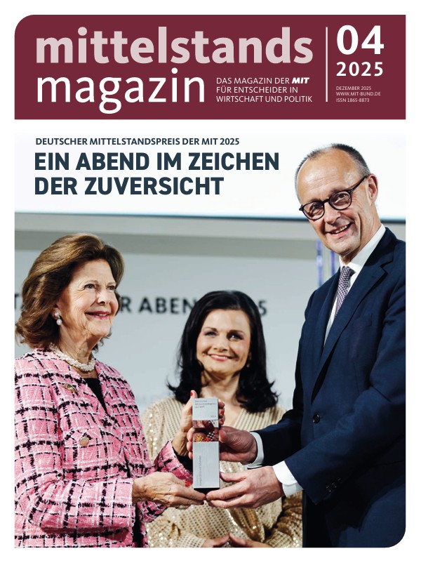 Das neue Mittelstandsmagazin ist da! In dieser Ausgabe lesen Sie alles über die glanzvolle Verleihung des Deutschen Mittelstandspreises der MIT. Stargast des Abends war Ihre Majestät Königin Silvia von Schweden, die den Preis aus den Händen von Bundeskanzler Friedrich Merz entgegennahm. Darüber hinaus lesen Sie ein Interview mit Gesamtmetall-Chef Oliver Zander über die notwendigen Änderungen, die unser Land jetzt braucht. Seine Forderung: „Die Rente braucht Strukturreformen, nicht Symbolpolitik.“ Das und vieles mehr lesen Sie im Mittelstandsmagazin. Reinschauen lohnt sich!