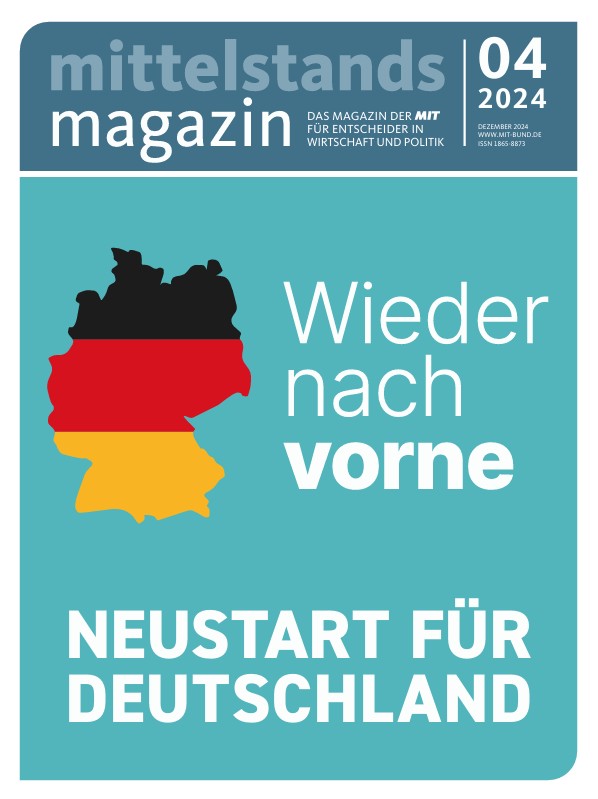 Das neue Mittelstandsmagazin ist da! In dieser Ausgabe hält CDU-Generalsekretär Carsten Linnemann ein Plädoyer für ein Land, auf das wir endlich wieder stolz sein können. Seine Devise: Wir müssen endlich wieder anpacken und unser Land verändern. Zudem gibt es neben einem Interview mit CSU-Landesgruppenvorsitzenden Alexander Dobrindt auch wieder hochkarätige Kolumnen und Reports.