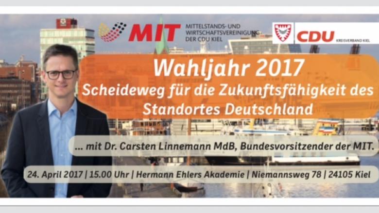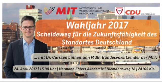 Dieses Jahr stehen zwei entscheidende Wahlen für unser Bundesland an. Im Mai werden wir einen neuen schleswig-holsteinischen Landtag wählen, im September dann einen neuen Bundestag. Beide Wahlen sind auch entscheidend für die Ausrichtung der Wirtschaftspolitik in unserem Bundesland. Deutschland steht in einem harten globalen Wettbewerb. Es wird entscheidend sein, ob wir in den nächsten Jahren die richtigen Maßnahmen einleiten, um mit einer leistungsfähigen Verkehrsinfrastruktur, einem konkurrenzfähigen Bildungssystem und einer klugen Digitalisierungsstrategie wettbewerbsfähig zu bleiben. Wir freuen uns sehr, dass wir für die Diskussion dieses Themas und den damit verbundenen Herausforderungen Dr. Carsten Linnemann MdB gewinnen konnten.