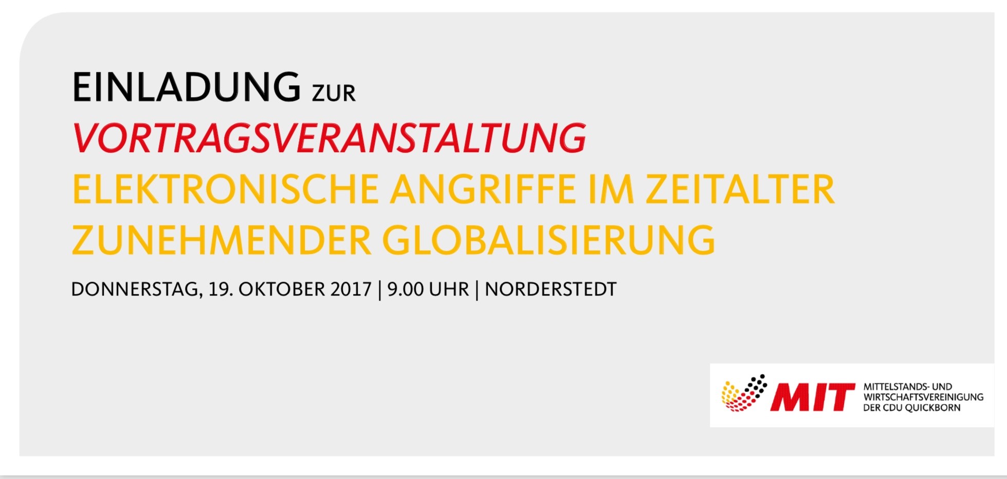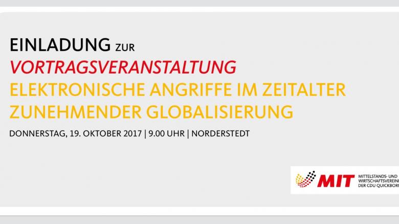 In Kooperation des Verfassungsschutzes Schleswig Holstein, Fachbereich Spionageabwehr und Wirtschaftsschutz, mit dem MIT-Stadtverband Quickborn laden wir Schleswig Holsteinische Unternehmen zu ein zu einer Vortragsveranstaltung