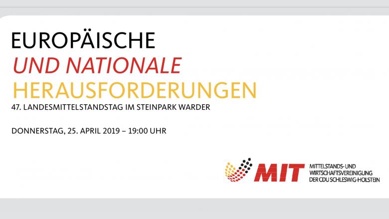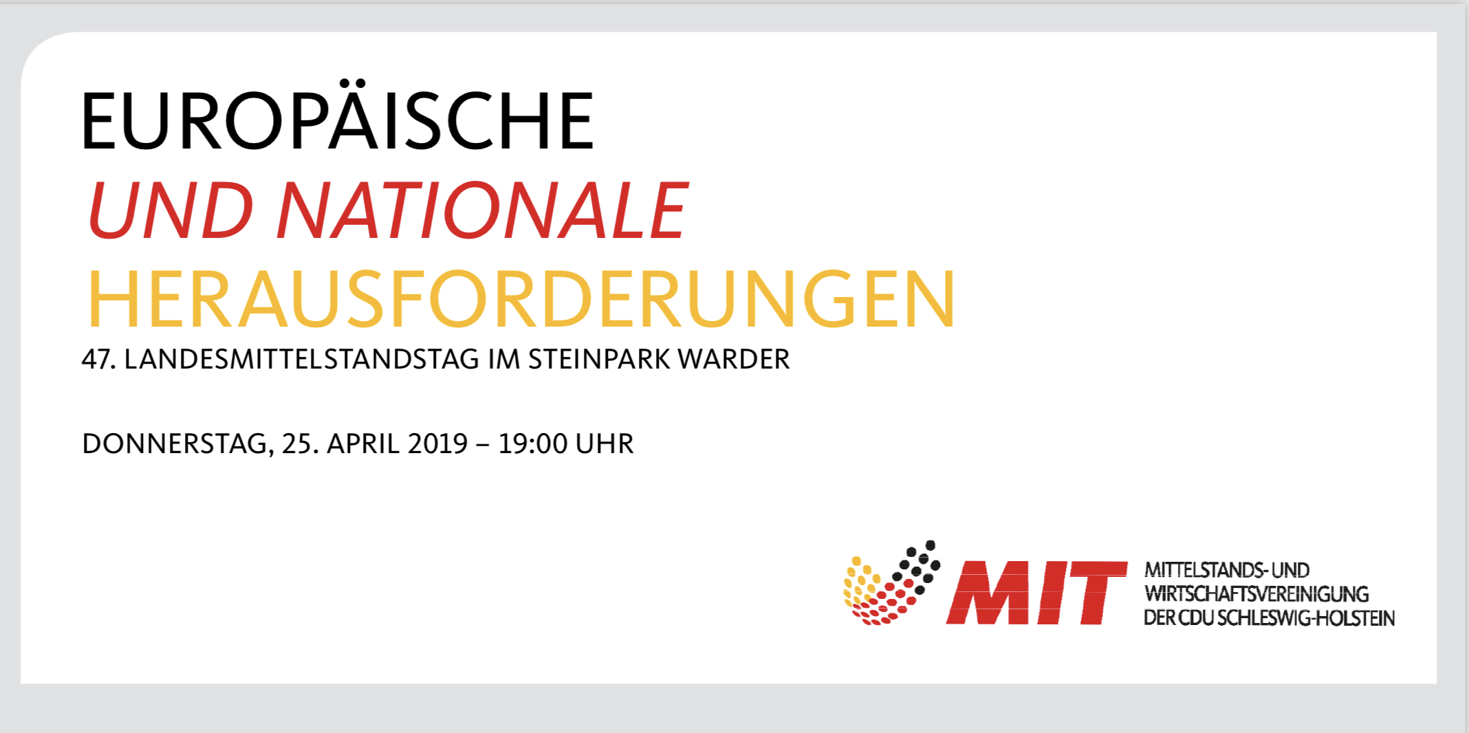 Die Mittelstands- und Wirtschaftsvereinigung der CDU Schleswig-Holstein (MIT Schleswig-Holstein) lädt ein zum öffentlichen (16 Uhr) und nichtöffentlichen (19 Uhr) Teil des diesjährigen Landesmittelstandstages.