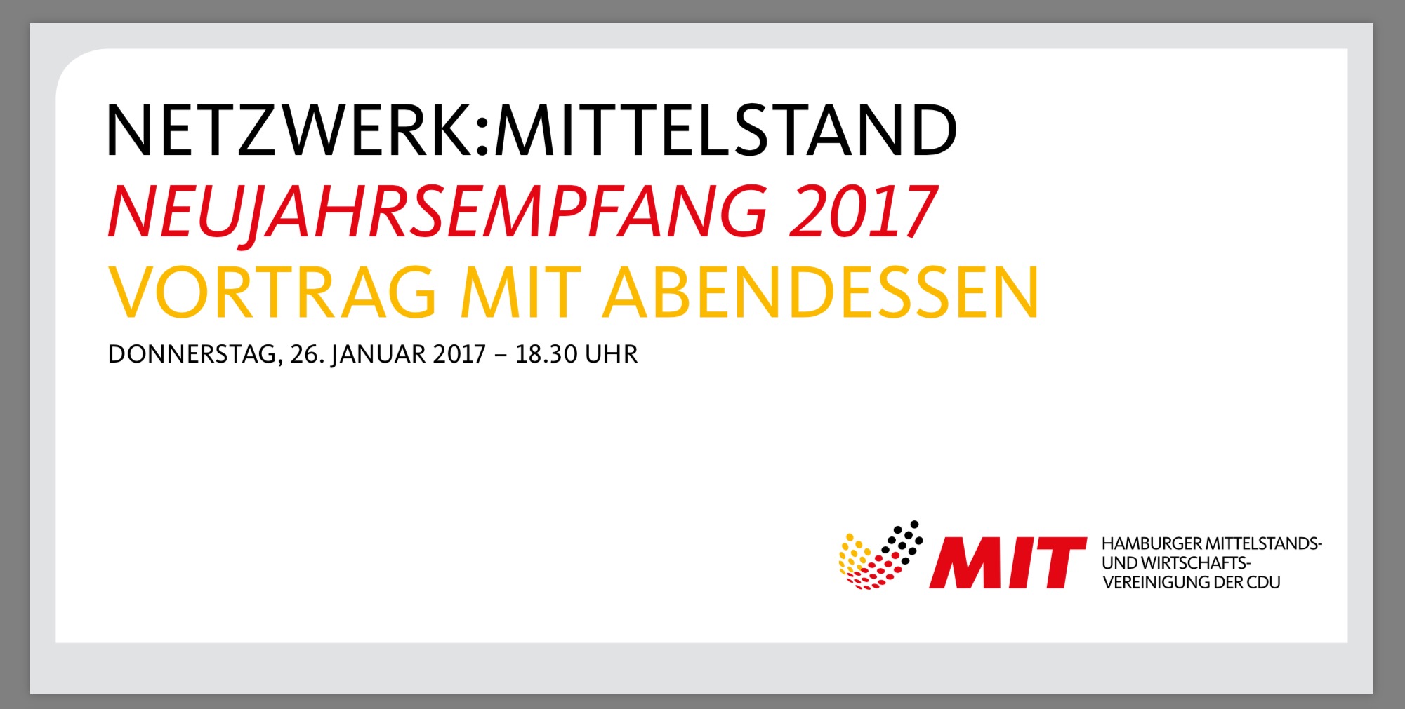 Wir freuen uns, Sie am 26. Januar 2017 zum Neujahrsempfang 2017 der Hamburger MIT zu sehen.