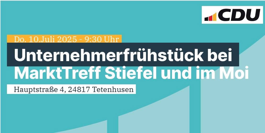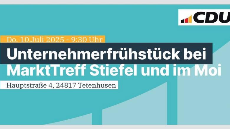 Die MIT Rendsburg-Eckernförde lädt herzlich ein zu ihrem nächsten Unternehmerfrühstück, diesmal am Donnerstag, den 10. Juli 2025 um 9:30 Uhr im "MarktTreff Stiefel" und im "Moi", Hauptstraße 4, 24817 Tetenhusen.